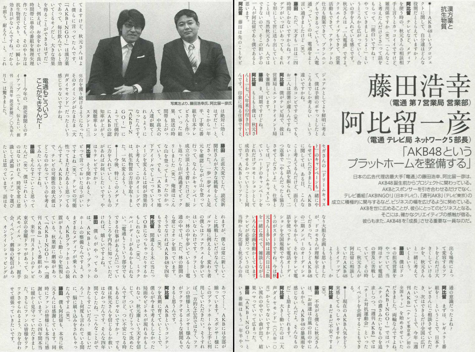 藤田(電通 営業部):『AKBINGO!』 という番組はもう一年半やってますけど、秋元さんはよく僕らに言ってたんです、「『AKBINGO!』は漢方薬であって、毎日飲んでいると聞いてくるものだし、大きな効果を得ることができるはずだ」と。例えば、お金をかけて良い時間帯に単発の番組を無理やり作ったとしても、そのやり方は抗生物質であり、その一瞬しか効き目がないんですね。だから「お前ら、耐えろ!」と。「これは絶対に聞くはずだ!」と。
